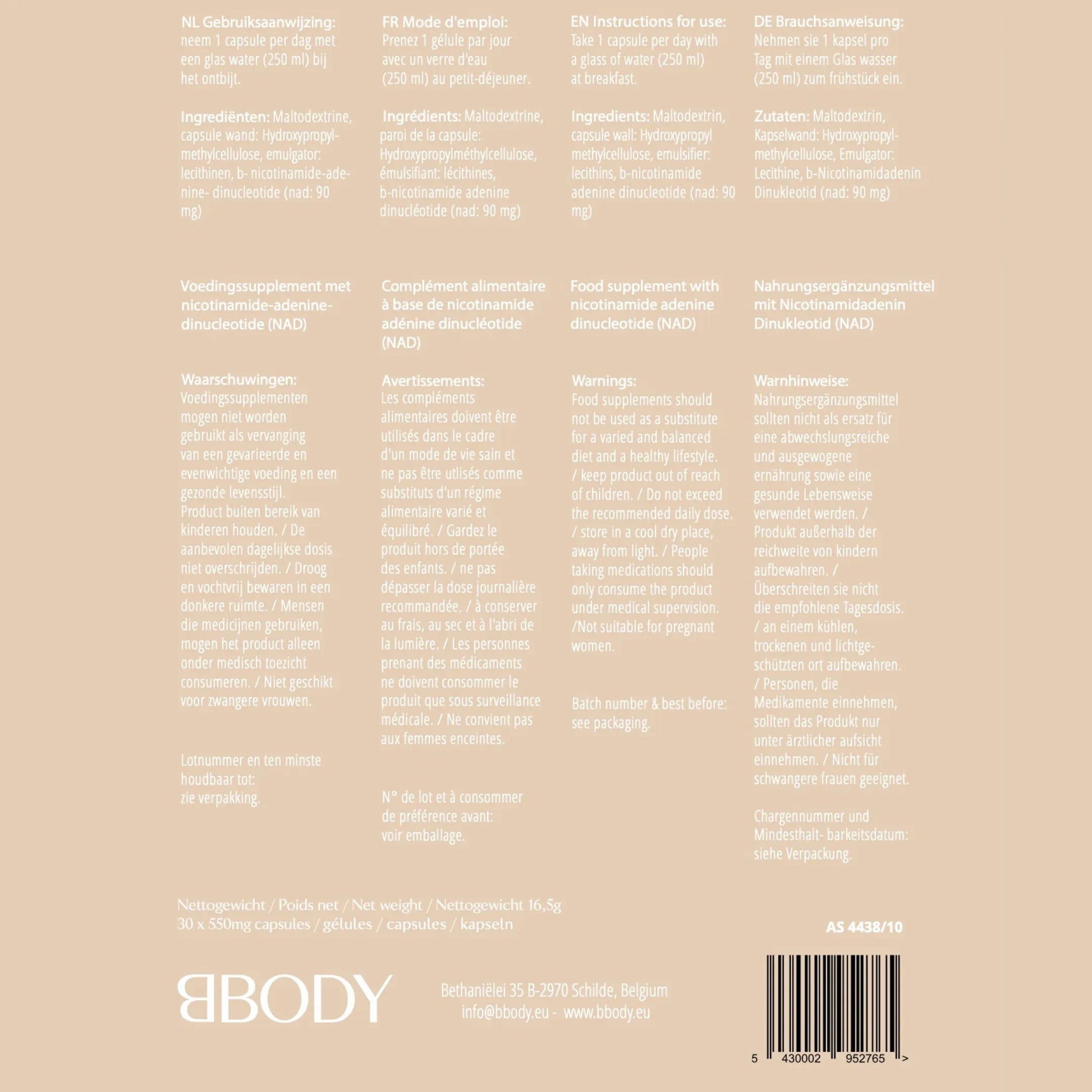 De NADH Capsules van BBODY zijn speciaal ontwikkeld om jouw lichaam een krachtige, natuurlijke boost te geven. Elke capsule bevat maar liefst 90mg NAD (Nicotinamide Adenine Dinucleotide + Waterstof), een biologisch actieve vorm van vitamine B3 die essentieel is voor de energieproductie in je cellen. Dankzij de liposomale technologie worden de ingrediënten optimaal door je lichaam opgenomen, zodat je maximaal profiteert van de voordelen.